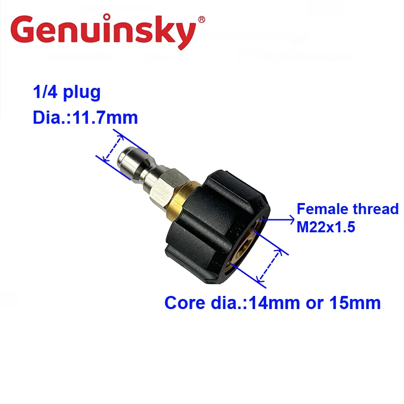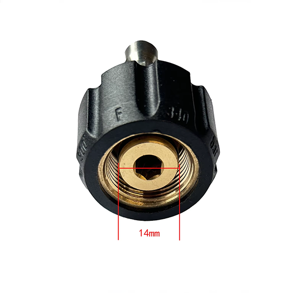 Tämä tuote on 1/4 tuuman nopea pistoke. Pikapistokkeen halkaisija on 11,7 m ja toinen pää on M22 × 1,5 naaraslanka. Valittavana on kaksi reikän halkaisijaa, ytimen dia.14 mm tai 15 mm. Sitä käytetään laajasti monissa korkeapaineisissa puhdistusskenaarioissa nykyaikaisessa yhteiskunnassa.
