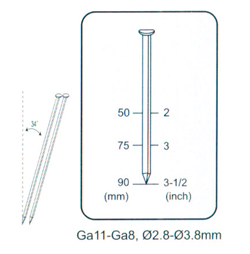 Kynsien tekniset tiedot ovat GA11-GA8, halkaisija 2,8-3,8 mm ja pituudet tyypillisesti 50 mm, 75 mm ja 90 mm (2 tuuman, 3 tuuman, 3-1/2 tuuman). Kynsijärjestelyn kaltevuuskulma on 34 astetta. Kynsien syvyys voidaan säätää työtarpeiden mukaan.