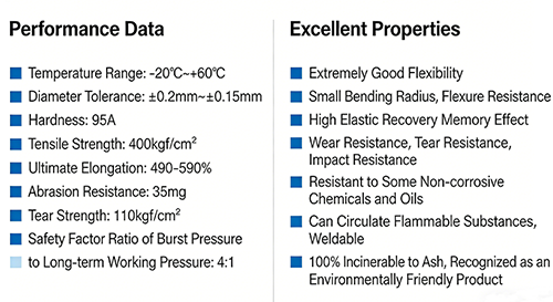Samanaikaisesti tuotteen kovuus on 95A, vetolujuus voi saavuttaa 400 kgf / cm², murtumavenymä on 490–590%, ja repäisylujuus on 110 kgf / cm², mikä ei ole vain tukeva, vaan sillä on myös erinomainen joustavuus. Se kestää toistuvaa taivutusta ja vetämistä käytössä, joten tuotanto Tuote on kestävämpi, mikä pidentää huomattavasti tuotteen käyttöikää.