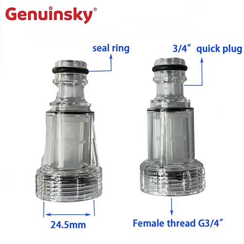 Keskeiset osat on myös varustettu tiivistirenkaalla, joka varmistaa tuotteen tiivistyksen ja voi estää vesivuotojen käytön aikana. Toisessa päässä on 3/4 "nopea pistoke rakenne. Pikarakenne voidaan asentaa ja purkaa nopeasti, mikä säästää suuresti toiminta-ajan. Ja asennus on hyvin yksinkertainen, ja ei-ammattilaiset voivat helposti asentaa sen. Samanaikaisesti se voidaan sopeutua moniin autonpesulaitteisiin, jotka ovat samanlaisia kuin Yili Lutian Batman Falcon Poseidon -sarjan autopesu-autopesurissa. Suodata ja sieppata lian epäpuhtaudet, kuten lietteet ja hiekka vedessä, jotta vältetään näiden epäpuhtauksien joutumisen yhteydessä autoon puhdistusprosessin aikana, jotta auto ei aiheuttaisi vaurioita.
