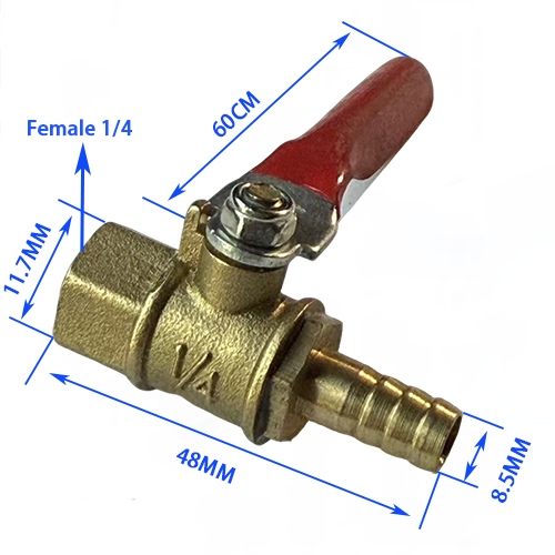 5. Naaraskierre + pagodimalli, tuotteen toinen pää on naaraskierre 1/4, halkaisija 11,7 mm ja toinen pää on 8,5 mm pagodin pää, venttiilirungon kokonaispituus on 48 mm ja kahvan pituus 60 mm, mikä sopii pääasiassa ilmakompressorin sisäkierreliitäntään ja letkun siirtoon.