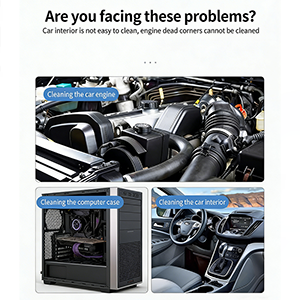 Auton istuinväli, oven säilytyslokero tai ilmastointikanava ja muut paikat ovat raskaita katastrofialueita, joissa lika ja kalkki piiloutuvat. Tällä pölypistoolisarjalla voit helposti poistaa pinttyneen pölyn vahingoittamatta auton kumiputkia ja elektronisia komponentteja. Pikaliitos henkitorven molemmissa päissä on myös erittäin käytännöllinen. Plug-in-suunnittelu ei vaadi muita monimutkaisia työkaluja. Se voidaan liittää nopeasti sisäiseen ilmapumppuun tai kannettavaan ilmakompressoriin. Pölynpoistotyöt voidaan suorittaa milloin tahansa ilman monimutkaisia operaatioita, mikä parantaa huomattavasti toiminnan tehokkuutta.