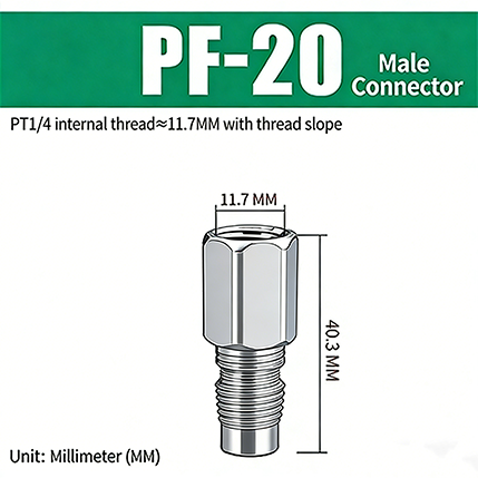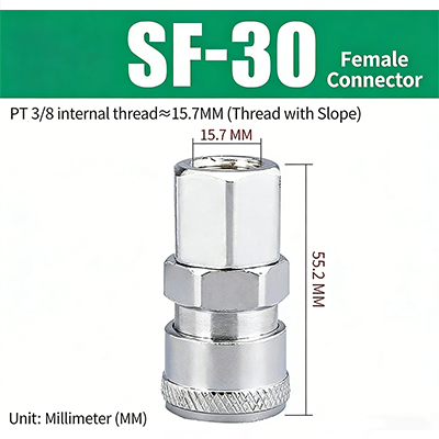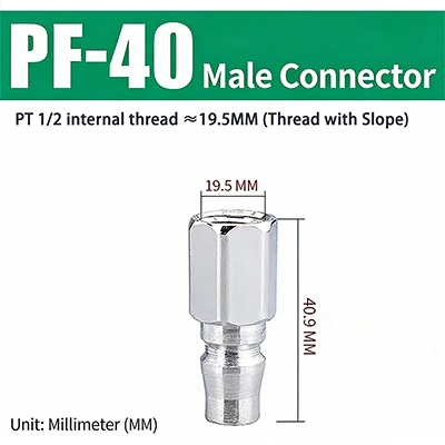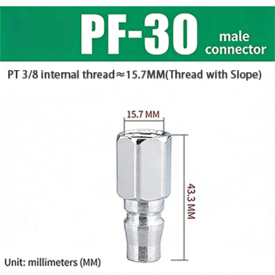 PF–SF-sarjan C-tyypin pikaliittimissä JIS PT-kierteellä on C-tyypin pikaliitinrakenne. Uros- ja naaraspäät voidaan sovittaa yhteen halutessasi, ja se voidaan kytkeä ja kytkeä, mikä on erittäin kätevää. Liitos käyttää pintagalvanointikäsittelyä, jossa on sisäinen kupariydin, joka ei ole vain korroosionkestävä, vaan myös kulutusta kestävä, mikä parantaa liitoksen kestävyyttä ja pidentää sen käyttöikää.