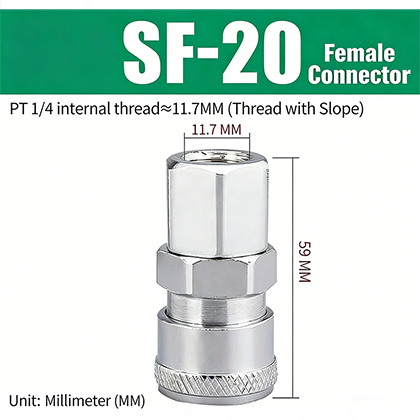 Genuinskyn PF–SF-sarjan C-tyypin pikaliittimissä JIS PT-kierteellä on C-tyypin pikaliitinrakenne, jonka avulla uros- ja naarasliittimet voidaan yhdistää vapaasti. Sähköpinnoitettu pinta ja kupariventtiilin ydin lisäävät tuotteen kestävyyttä. Ammattimaisena kiinalaisena pneumaattisten työkalujen toimittajana Genuinsky valmistaa tuotteensa täysin standardoinnin mukaisesti. Tämä sarja tarjoaa täydellisen valikoiman teknisiä ominaisuuksia, jotka mahdollistavat tarkan sovituksen erilaisten pneumaattisten putkistojen kanssa.