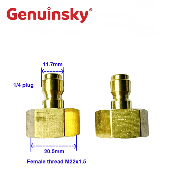 Tämä tuote on nopea pistoke 1/4 tuuman naarasauhan M22-liitin, jossa on 1/4 pistoke toisessa päässä, halkaisija 11,7 mm ja naispuolinen lanka M22 × 1,5 toisessa päässä, halkaisija 20,5 mm, joka sopii korkeapainepesukonten puhdistuslaitteille.