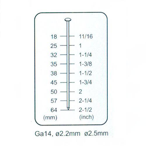 ST -64 teräsrivin kynnet on valmistettu keskipitkästä hiiliteräksestä, kynsien halkaisija 2,2 mm ja pituusalue 18 mm - 64 mm. Toisessa päässä on tasainen pää ja toinen pää on terävä. Tämä malli sopii koristeellisten materiaalien, puisten pakkausten ja muiden skenaarioiden kiinnittämiseen. Käytännössä ST-64-teräskynnet voidaan naulata suoraan seinään, eliminoimalla perinteinen porausreiän porausvaihe ja naulata sitten puisia kiiloja, mikä johtaa suurempaan rakennustehokkuuteen. Kun sitä käytetään 4-8 barin paineessa, vaikutus on parempi. Kun valitset kynsien pituuden, kynsien pituuden objektin kiinnittämiseksi tulisi olla 1,5-2,5 cm pidempi kuin roikkuva esine, joka on turvallisempi ja vähemmän todennäköisesti vaurioittaa seinää.