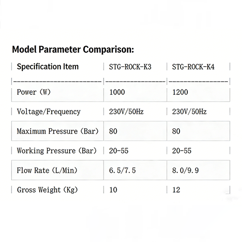 Ensinnäkin, vertaa joitain K3:n ja K4:n suorituskykyparametreja. Molemmat mallit on varustettu alumiiniseoskorkeapainepumpuilla. Tämän materiaalin etuja ovat korroosionkestävyys, kestävyys ja korkea suorituskyky. Samaan aikaan molemmissa on hiljaiset oikosulkumoottorit. Erona on, että K3:n teho on 1000W ja K4:n teho on 1200W, mikä on alhainen melu tehokkaassa ajettaessa. , ei ole helppoa aiheuttaa naapuruuskiistoja kotikäyttöskenaarioissa. Molempien mallien jännite/taajuus on 230V/50Hz, maksimipaine on 80bar ja käyttöpaine voi olla 20-55bar. Erona on se, että K3-mallin virtausnopeus on 6,5/7,5 l/min ja K4-mallin virtausnopeus on 8,0/9,9 l/min.