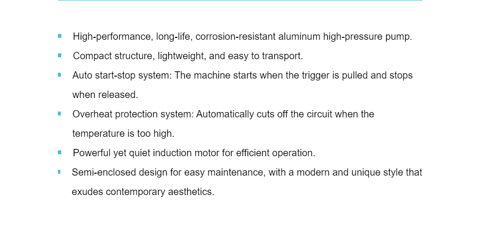 Toiseksi kannettava STG-ROCK-K korkeapainepesuri on kompaktin rakenteen kokonaisuutena, ja kehon kokonaispaino on erittäin kevyt. K3:n nettopaino on 10kg ja K4:n nettopaino 12kg, molemmat on varustettu kahvakuviolla ylhäällä, mikä on kätevää. Käyttäjät voivat liikkua siivoustarpeidensa mukaan kotoa ulkona. Samalla laite on varustettu älykkäillä automaattisilla käynnistys-stop- ja ylikuumenemissuojatoiminnoilla. Vedä ruiskutuspistoolin liipaisinta käynnistääksesi ja vapauta liipaisin pysähtyäksesi. Käsikytkintä ei tarvita, mikä tekee käytöstä mukavampaa. Ylikuumenemissuojan avulla laite voi automaattisesti katkaista piirin, kun lämpötila on liian korkea, välttää koneen vaurioitumista aiheuttavan ylikuormituksen, parantaa yleistä turvallisuutta ja tehdä tuotteesta turvallisemman ja huolettomamman käytön aikana. Rungon puolisuljettu rakenne on myös hyvin humanisoitu, mikä on kätevä päivittäiseen huoltoon, ja se voi helposti tarkistaa osat ja puhdistaa suodattimen.