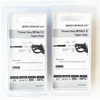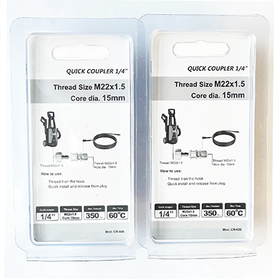 Näiden kahden eritelmän 1/4 kytkentä on erikokoiset mallit. Yksi on M22 × 1,5, jonka halkaisija on 22 mm, joista ydin DIA.15 mm. Toinen on M14 × 1,5, halkaisija 14 mm ja kapeneva reikä. Tuotteen kahden koon suunnittelu on erittäin tarkka, joka voidaan sopeutua tarkasti asiaankuuluviin sovituspuhdistuskoneisiin ja jota käytetään korkeapaineisten pesuletkun liittimiin. Itse tuotteen materiaali on messinki. Messinkimateriaalilla on hyvä korroosionkestävyys. Korkean paineen puhdistustöiden on usein kohdattava kostea ympäristö. Siksi itse tuotteen korroosionkestävyys voi toimia normaalisti monissa ankarissa työympäristöissä. Samanaikaisesti messinkillä on hyvä ulottuvuus ja kovuus, ja korkeapaineisessa vedessä itse tuotteen kestävyys voidaan ylläpitää iskuina, eikä sitä ole helppoa murtaa, mikä aiheuttaa vesivuotoja ja vähentää laitteiden korvaamisen kustannuksia. Yleiskäyttöisten skenaarioiden kustannukset sisältävät kodinpuhdistuksen, teollisuuslaitteiden puhdistuksen tai ulkoilmahaitoksen puhdistuksen. Näiden puhdistusprosessien aikana asennus tai purkaminen voidaan suorittaa nopeasti. Käyttäjät voivat nopeasti suorittaa yhteystyöt ilman työkalujen apua, mikä parantaa huomattavasti työtehokkuutta ja säästää aikaa. Samanaikaisesti näiden kahden eritelmän 1/4 -kytkimen koko on myös erittäin sopiva. Käyttäjät voivat helposti ja joustavasti suorittaa liitäntäoperaation yhdellä kädellä.